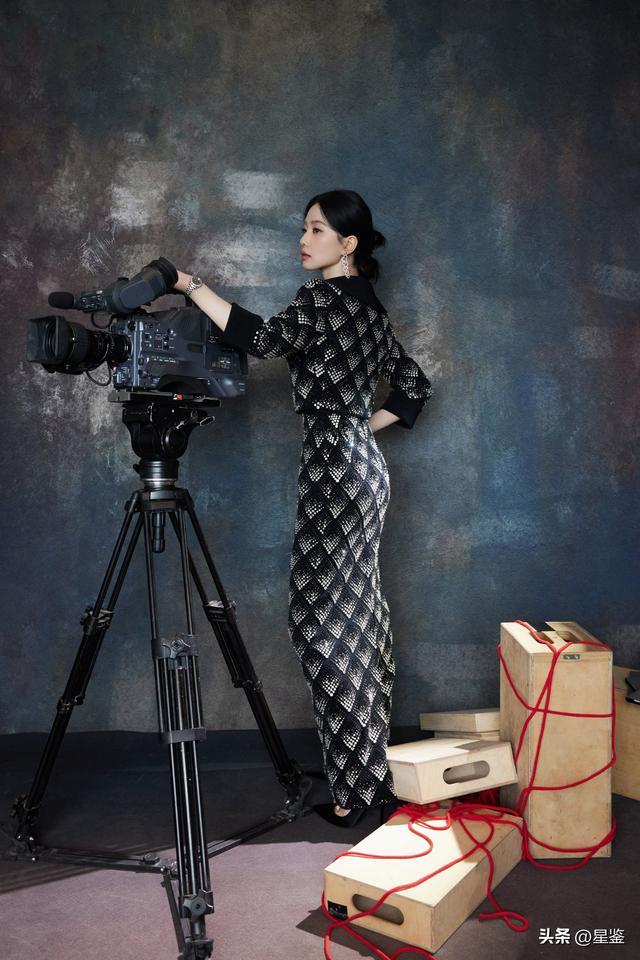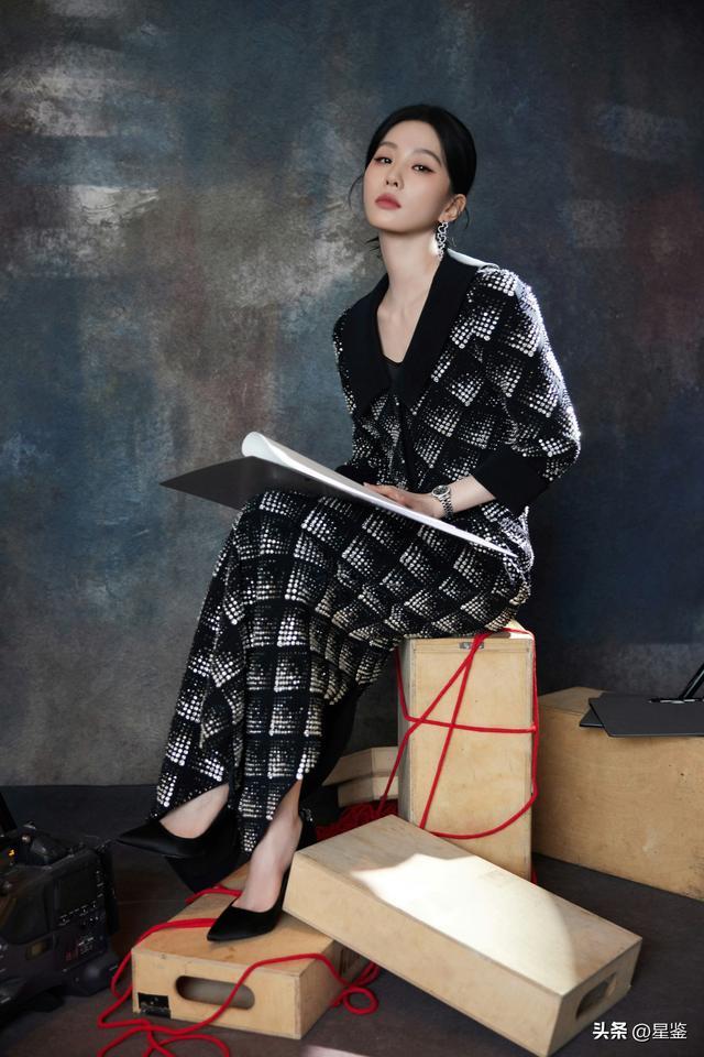一身黑底菱格烫钻套装,是那种越看越有味道的设计。菱格纹自带复古质感,满钻点缀在光线下闪而不艳,不会像普通亮片裙那样俗气,反而有种低调的奢华感。利落的翻领和七分袖剪裁,弱化了大面积钻饰的华丽感,多了几分干练利落,连鱼尾裙摆都被衬得优雅又有力量。