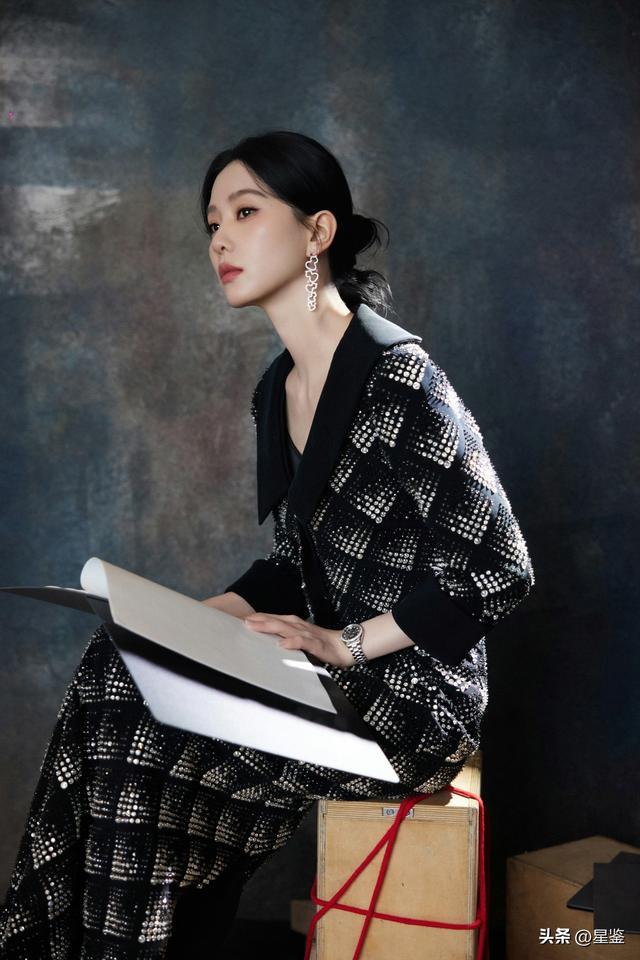 她最绝的地方,就是用配饰平衡了整套look。同色系的黑尖头皮鞋,和衣服的翻领、袖口呼应,让整体造型更完整;银色腕表和满钻耳饰,又悄悄提亮了一身黑,既不抢戏,又能在细节处透着精致。低马尾的发型,把肩颈线条露了出来,和耳饰的垂坠感完美适配,温柔里又带着几分清冷的锋芒。
